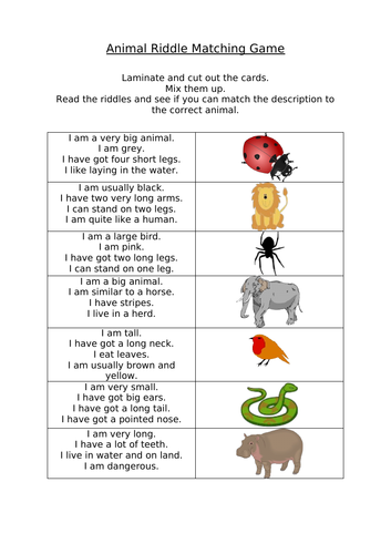 Animal Riddles Worksheets - English Created Resources Animal Riddles Worksheets Teachers' Library 25 December 2020 (0) Kids will know more words related to Animals. They will know how to describe animals through this amazing activity. They will read the text and try to guess the name of the animal. They will cut and paste the pictures.